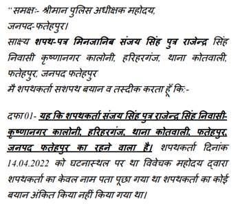 122. In all the said five chargesheets, the same six persons, namely Pramod Kumar Dixit, Rajesh Kumar Trivedi, Virendra Kumar, Sanjay Singh, Sri Keshan and Satyapal have been mentioned as the victims. We have gone through the affidavits of Pramod Kumar Dixit, Sanjay Singh and Rajesh Kumar Trivedi, all of which are dated 24.05.2022. It is interesting to note that the said three affidavits have been deposed in an identical fashion, except the name of the deponent. The e-stamp paper attached to the three affidavits bears the time stamp of 10:54, 10:55 and 10:52 AM respectively. The only reasonable inference that can be drawn from a perusal of the said three affidavits submitted by the victim-witnesses is that the same have been prepared in a cyclostyled manner, with the same draft having been copied and pasted after changing the personal details of the deponents. We are also at a loss to understand the requirement of submission of affidavits by the victim-witnesses to the Superintendent of Police. The scheme provided under the Cr. P.C. does not require the making of Section 161 statements on oath. As far as statements under Section 164 are concerned, they are to be made before a judicial officer. It is hardly necessary to mention in such circumstances that the statements of the victim-witnesses do not inspire any confidence in supporting the prosecution version contained in the FIR. As a translated copy of the same is not on record, we are reproducing the original untranslated version of the affidavit submitted by Sanjay Singh hereinbelow:
