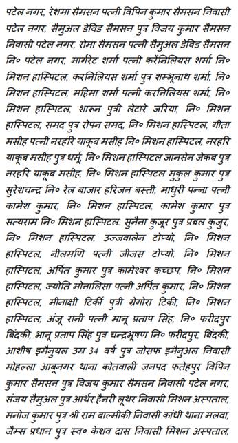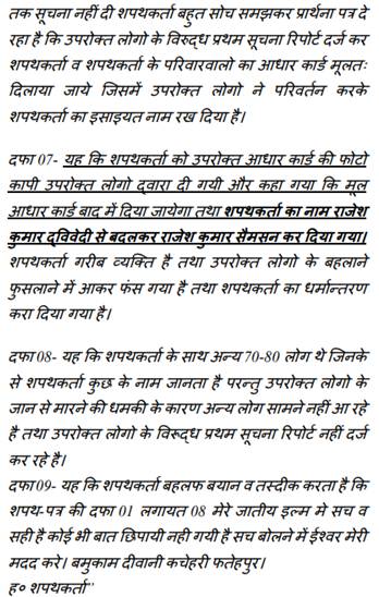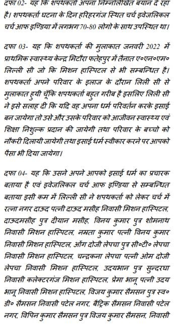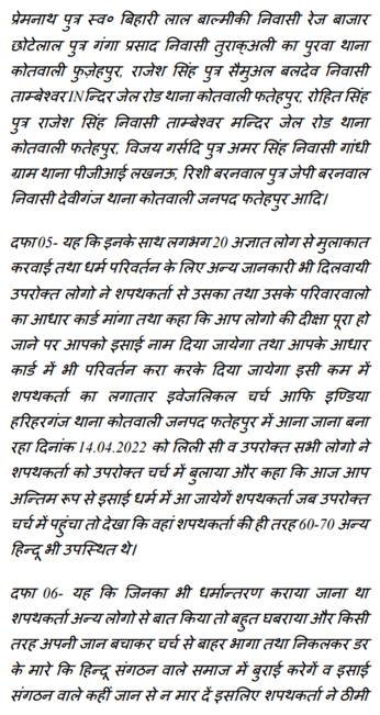 “Virendra Kumar son of Dinesh Chandra, aged about 23 years, resident of Nappi Ka Haata, Hariharganj, Police Station Kotwali, District Fatehpur is telling upon asking that on dated 14.04.2022, the act of religion conversion of the innocent Hindus about 90 in number was running forcibly and fraudulently in the Evangelical Church of India situated at Hariharganj, which was informed to the Hindu Organizations by the local people, on receiving the information, Himanshu Dixit, Co-Secretary of the Vishwa Hindu Parishad (World Hindu Council) reached on the spot along with his all activists, among whom I was also included, then the act of religious conversion was going on there. Himanshu Dixit reported this matter to the Administrative Officers by reaching on the spot and requested them to come on the spot. When the Administrative Officers reached on the spot then they interrogated inn this reference from Vijay Masih, father of the Church then the Father Vijay Masih confessed it that by converting the religion of the Hindus by committing cheat and fraud with them and converting them into Christianity, we change their documents by tampering with the documents of their names. The aforesaid religion conversion procedure is running since past 34 days in which all the Hindus are called, the aforesaid procedure completes in 40 days. We attempt to convert the religion of the patients also came in the Mission Hospital by converting their religion. All the employees of Mission Hospital play an important role in it. The names of the people brought for conversion of religion today on 14.04.2022 in presence of the Administration are Ratna Daood wife of Daood Masih, resident of Mission Hospital, Daood Masih son of Diwan Masih, resident of Mission Hospital, Mobile No. 6392565880, present address Dehradun Pal Mohalla, Jali Ground, Vinay Kumar son of Sobhnath, resident of Mission Hospital, Namrata Kumari wife of Vinay Kumar, resident of Mission Hospital, Oang Dorji Lepcha son of T.T. Lepcha, resident of Mission Hospital, Chandrakana Lepcha wife of Oang Dorgi Lepcha, resident of Mission Hospital, Udaybhanu son of Sundargha, resident of Collectorganj, Mission Hospital, Prema Bhanu wife of Udaybhanu, resident of Mission Hospital, Vijay Kumar Samsung son of Late D. Samsung, resident of Patel Nagar, Battric Samsung wife of Vijay Kumar Samsung, Patel Nagar, Rut Shalini Samsung daughter of Vijay Kumar Samsung, resident of Patelnagar, Vipin Kumar Samsung son of Vijay Kumar Samsung, resident of Patel Nagar, Reshma Samsung wife of Vipin Kumar Samsung, resident of Patelnagar, Samuel David son of Vijay Kumar Samsung, resident of Patel Nagar, Roma Shalini Samsung wife of Samuel David Samsung, resident of Patel Nagar, Margrate Sharma wife of Corlinius Sharma, resident of Mission Hospital, Corlinius Sharma son of Shambhusharan Sharma, resident of Mission Hospital, Mahima Sharma daughter of Carlinius Sharma, resident of Mission Hospital, Shailendra daughter of Letare Zariya, resident of Mission Hospital, Piyara Samad son of Ropan Samad, resident of Mission Hospital, Gita Masih wife of Narhari Yaqoob Masih, resident of Mission Hospital, Narhari Yaqoob Masih son of Dharmu, resident of Mission Hospital, Johnson Jacob son of Narhari Yaqoob Masih, resident of Mission Hospital, Mukul Kumar son of Surendra Chandra, resident of Rail Bazar, Harijan Basti, Madhuri Panna wife of Kamesh Kumar, resident of Mission Hospital, Kamesh Kumar son of Satyaram, resident of Mission Hospital, Sunaina Kujoor, Prabal Kujoor, residents of Mission Hospital, Ujjawalen Topiyon daughter of Jesus Topiyo, resident of Mission Hospital, Akshata Topiyo daughter of Lavash Topiyo, resident of Mission Hospital, Neelmani Topiyo wife of Jesus Topiyo, resident of Mission Hospital, Arpit Kumar son of Kamshwar Kachhap, resident of Mission Hospital, Jyoti Monalisa wife of Arpit Kumar, resident of Mission Hospital, Minakshi Tirky daughter of Gregora Tirky, resident of Mission Hospital, Anju Rani wife of Bhanu Pratap Singh, resident of of son Bhanu Pratap Singh Faridpur Bindki, Chandrabhushan, resident of Faridabad, Bindki, Ashish Emanuel aged about 34 years son of Josuf Emanuel, resident of Mohalla Abunagar, Police Station Kotwali, District Fatehpur, Vipin Kumar Samsung son of Vijay Kumar Samsung, resident of Patel Nagar, Sanjay Samuel son of Arthur Henry Luther, resident of Mission Hospital, Manoj Kumar son of Shri Ram Balmiki, resident of Kandhi Police Station Malwa, James Pradhan son of Late Keshav Das, resident of Mission Hospital, Premnath son of Late Bihari Lal Balmiki, resident of Rail Bazar, Chhotelal son of Ganga Prasad, resident of Turab Ali ka Purwa, Kotwali Fatehpur, Rajesh Singh son of Samuel Baldev, resident of Tambeshwar Mandir, Jail Road, Police Station Kotwali Fatehpur, Vijay Masih son of Amar Singh, residne of Gandhi Gram, Police Station P.G.I. Lucknow, Rishi Barnwal son of J.P. Baranwall, resident of Deviganj, Police Station Kotwali, District Fatehpur etc., about 20 unknown people were causing the religion conversion of about 90 Hindus along with them. As soon as the aforesaid people received the information of arrival of the Hindu Organizations and the Administrative Officers, then the aforesaid people caused to take out them silently from the backdoor. Just it is my statement.”