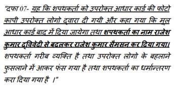 123. A perusal of the extract reproduced above to which emphasis has been supplied indicates the glaring error in the making of the above affidavit. While the name of the deponent is Sanjay Singh, in paragraph 7 of the affidavit, he has deposed that his name in the Aadhar card was changed from “Rajesh Kumar Dwivedi” to Rajesh Kumar Samson” by the accused persons.
