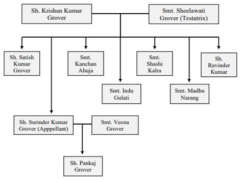 4. The execution of the subject Will has been proved by examining the beneficiary of the subject Will, i.e., Appellant/PW1, two attesting witnesses, i.e., Sh. S.V. Goel/PW2 [hereinafter referred to as ‘Sh. Goel’] and Sh. Harbans Lal Saini/PW6 [hereinafter referred to as ‘Sh. Harbans’] and a scribe, i.e., Smt. Veena Grover/PW5 [hereinafter referred to as ‘Smt. Veena’], who is the daughter-in-law of the Testatrix and wife of the beneficiary/Appellant. Further, the Respondents have examined Sh. Ravinder, Smt. Indu Gulati and Sh. Kamal Kumar Grover, son of Late Sh. Satish Kumar Grover [hereinafter referred to as ‘Sh. Satish’].
